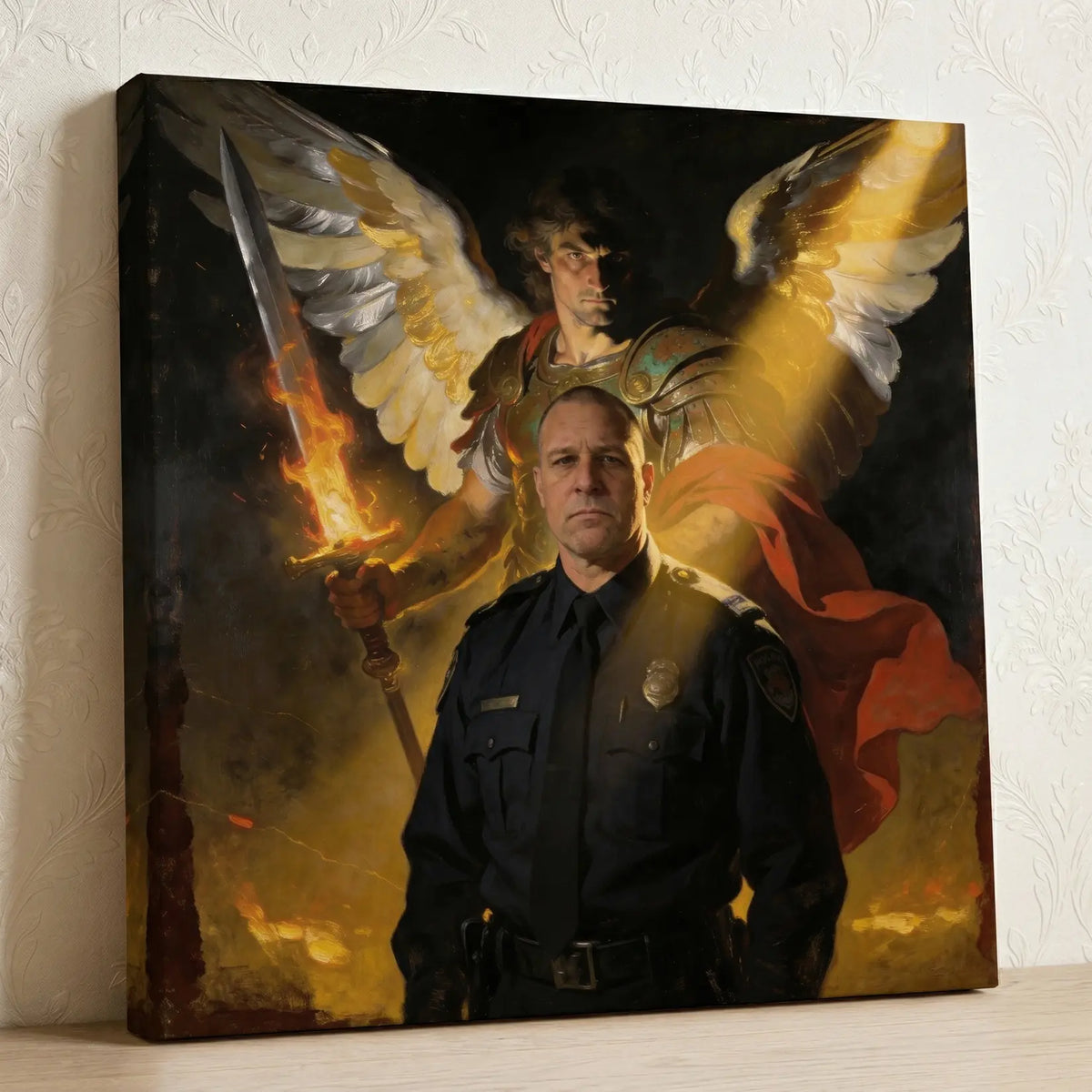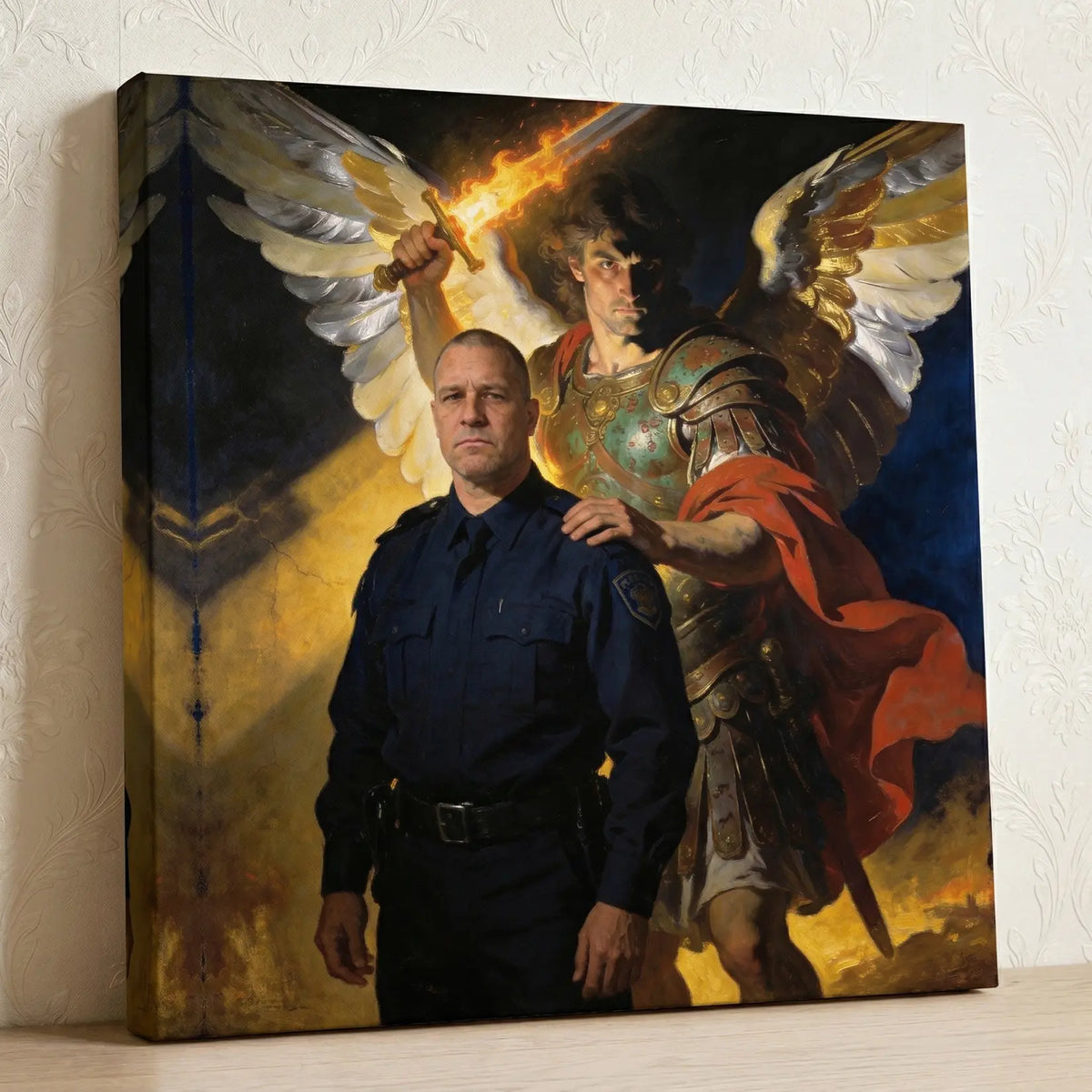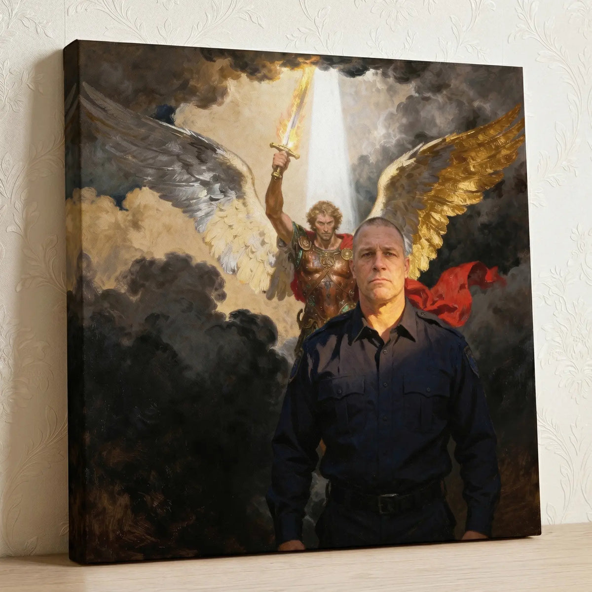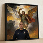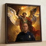 A personalized Christian gift for the family behind the badge. Archangel Michael, patron saint of police officers, towers behind your officer in a devotional canvas painting. Created from your photo. Upload a picture and see a free preview.